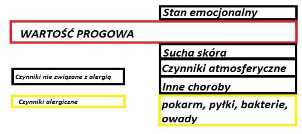 Na natężenie objawów klinicznych mają wpływ zarówno czynniki alergiczne jak i czynniki niezwiązane z alergią. Objawy kliniczne pojawiają się dopiero po zsumowaniu tych czynników i przekroczeniu tak zwanego progu świądowego.