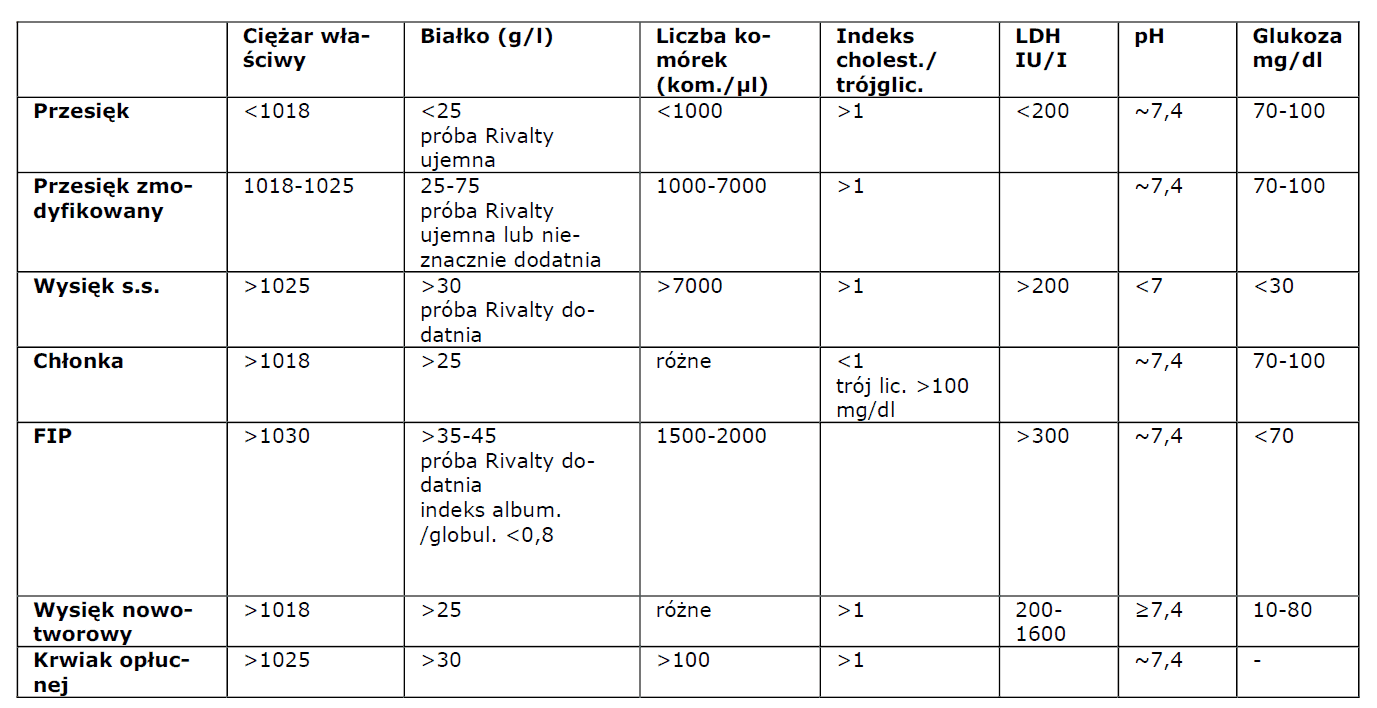 Badania fizykochemiczne płynu wysiękowego służą głównie różnicowaniu pomiędzy przesiękiem, przesiękiem zmodyfikowanym, wysiękiem i chłonką. Często jednak niezbędne jest uzupełniające badanie cytologiczne w celu ograniczenia potencjalnego zakresu czynników etiologicznych. W celu oznaczenia liczby komórek i poziomu białek oraz wykonania cytologii płyn można przesłać w probówce z EDTA.