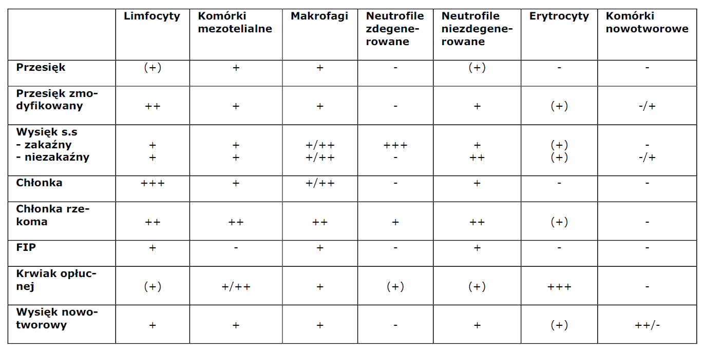 Na podstawie liczby i rodzaju komórek (rys. 2) w płynie można często określić przyczynę wysięku (tabela nr 2).