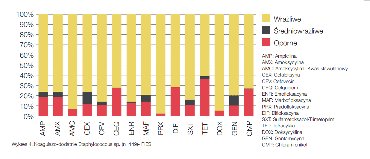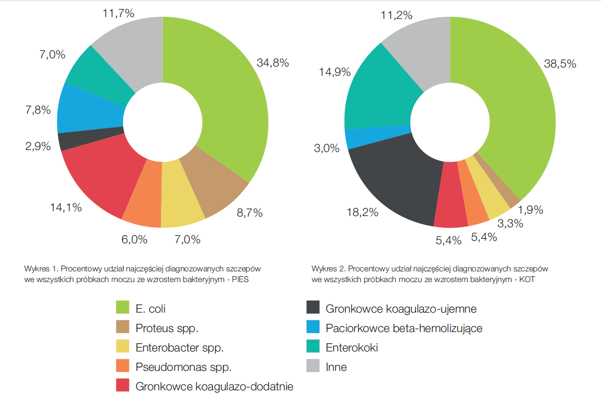 Jak już wyżej wspomniano, wytyczne ISCAID należy interpertować uwzględniając m.in. lokalne prawodawstwo. Dodatkowo ważne są informacje o aktualnie diagnozowanych szczepach bakterii w próbkach moczu oraz o rodzaju stwierdzanej antybiotykooporności. Warto też rozważyć te kwestie w wymiarze lokalnym, tj. w odniesieniu do próbek od pacjentów z konkretnej lecznicy, kliniki czy gabinetu weterynaryjnego. Nie powinno się na przykład rozpoczynać terapii substancją czynną, względem której więcej niż 10% pacjentów danej kliniki wykazuje oporność. Nadal częściej do badania mikrobiologicznego zostaje dostarczany mocz z mikcji spontanicznej zamiast z cystocentezy. Aby przy tego rodzaju próbce móc odróżnić infekcję od kontaminacji, należy zwrócić uwagę na ilościowy wynik badania. Na wykresie 1 i 2 przedstawione zostały najczęściej oznaczane przez LABOKLIN szczepy bakterii w próbkach moczu psów i kotów w 2013 roku.