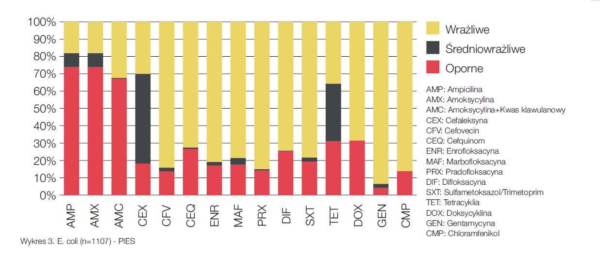 Do czterech najczęściej diagnozowanych szczepów bakterii w próbkach moczu psów należą: E.coli, gronkowce, Proteus spp. oraz paciorkowce beta-hemolizujące. Łącznie są one odpowiedzialne za ponad 65% infekcji dróg moczowych. Antybiotykoterapia w zakażeniach dolnych dróg moczowych.