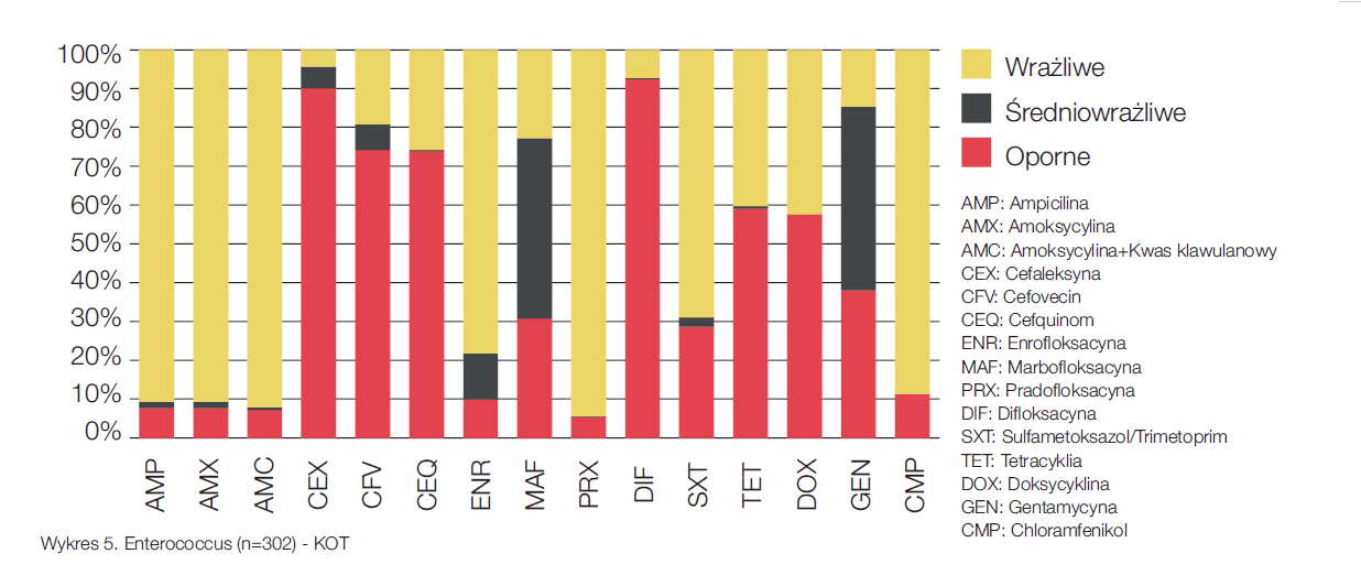 Aby sprawdzić, czy antybiotyki zalecane przez ISCAID do terapii empirycznej byłyby skuteczne w naszych warunkach, przeanalizowaliśmy dane z antybiogramów. Niżej zamieszczone wykresy przedstawiają wyniki tych analiz dla najbardziej znaczących grup drobnoustrojów w zakażeniach dróg moczowych. Wykres nr 3 pokazuje rodzaje oporności wyznaczone dla E.coli z moczu psów. W przypadku kotów wykres ten byłby zbliżony. Wykres nr 4 przedstawia koagulazo-dodatnie gronkowce u psów. Podobnie wyglądałby wykres dla koagulazo-ujemnych gronkowców u kotów. Rzadziej diagnozowane u kotów gronkowce koagulazo-dodatnie są z reguły nieco bardziej oporne. Na wykresie nr 5 przedstawione są enterokoki z moczu kotów. Aby odpowiedzieć na wyżej postawione pytanie, zestawiliśmy cztery najczęściej diagnozowane szczepy bakterii w moczach psów i kotów z czterema najczęściej stosowanymi substancjami czynnymi w terapii empirycznej. ISCAID zaleca użycie w terapii empirycznej amoksycyliny lub sulfametoksazolu z trimetoprimem, przy pierwszeństwie dla amoksycyliny. Amoksycylina stosowana w infekcjach wywołanych przez E.coli, cieszy się w wielu krajach europejskich bardzo dobrą skutecznością. Jak przedstawia wykres nr 3 tendencja ta nie jest widoczna w naszych warunkach. Bazując na danych z antybiogramów można stwierdzić, iż antybiotykiem preferowanym przy mieszanych infekcjach dróg moczowych powinien być sulfametoksazol (wykres nr 6). Jeśli w ramach mikroskopowego badania osadu moczu możliwe jest różnicowanie między pałeczkami a ziarniakami i widoczne są ziarniaki, to zalecane jest użycie amoksycyliny, która osiąga wysoką koncentrację w moczu. Enrofloksacyna powinna być zarezerwowana dla bardzo skomplikowanych przypadków.