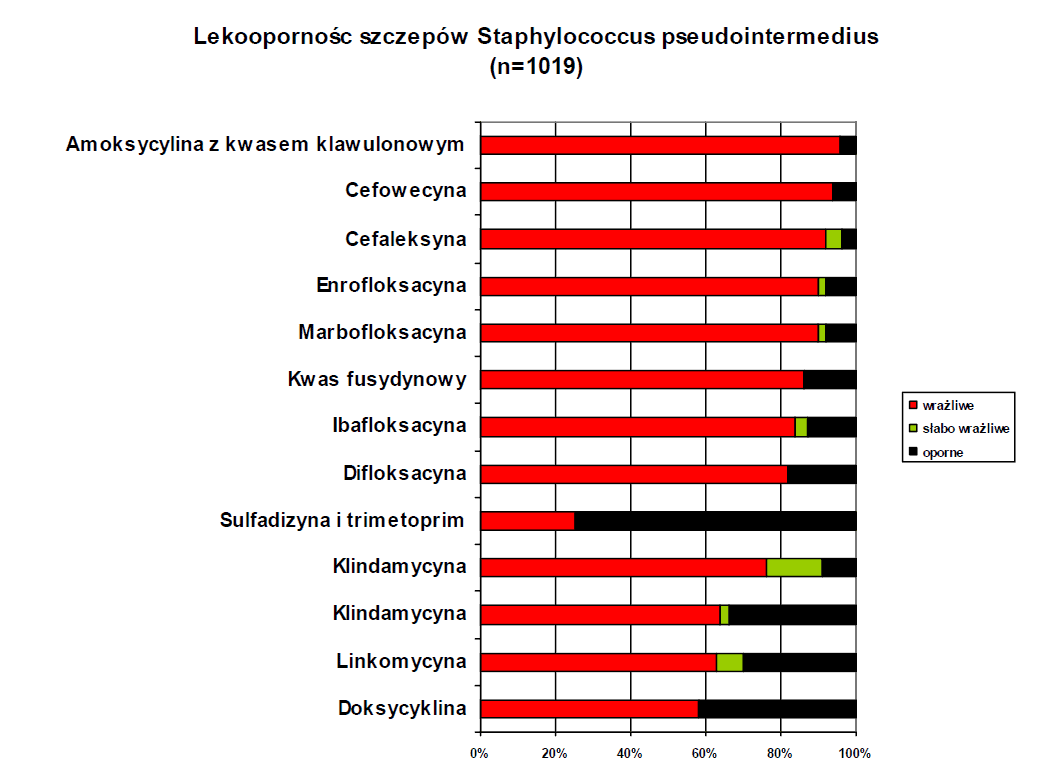 Ze względu na stale rosnącą oporność gronkowców, a w szczególności wśród szczepów Staphylococcus aureus (MRSA) i Staphylococcus pseudointermedius (MRSP), nieodzownym działaniem jest różnicowanie szczepów połączone ze sporządzeniem antybiogramu. Wśród gronkowców koagulazododatnich (S. Aureus, S. Pseudointermedius) udział szczepów MRSA i MRSP, czyli opornych na metycylinę, wynosi odpowiednio 3,2% i 8,1%. Gronkowce oporne na metycylinę są rownież potencjalnie oporne na antybiotyki beta-laktamowe (penicyliny, cefalosporyny, karbapenemy), a w przypadku szczepów wieloopornych oporność dotyczy także dalszych grup antybiotyków. Jak widać na wykresie status opornościowy szczepów wrażliwych i szczepów opornych na metycylinę znacznie się różni.
