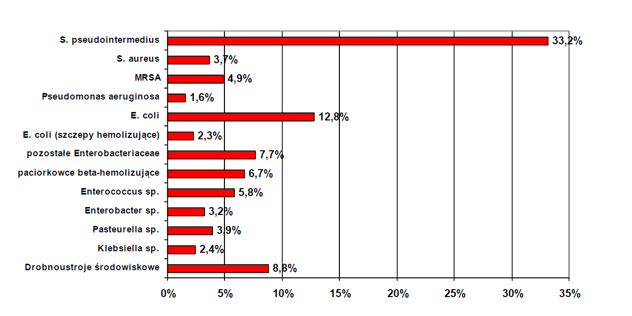 Na przestrzeni roku 2008 przebadano ogółem 578 wymazów pobranych z ran, przy czym w 70% przypadków stwierdzono obecność chorobotwórczych drobnoustrojów. Drobnoustrojami izolowanymi najczęściej u psów były szczepy S. pseudointermedius, a w dalszej kolejności szczepy E.coli i S.aureus (MRSA).