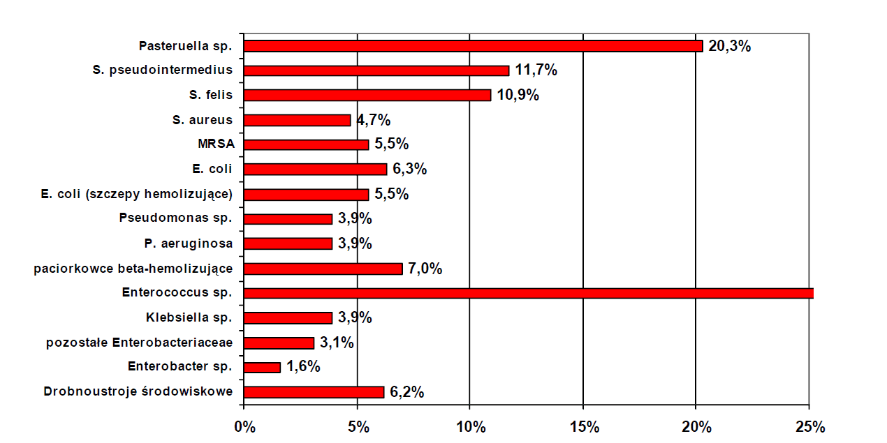 U kotów izolowano najczęściej szczepy Pasteurella spp., a w dalszej kolejności E.coli, S.pseudointermedius, S.felis, S. Aureus (MRSA).