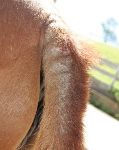 Często spotykane jest grzbietowe i/lub brzuszne rozmieszczenie zmian. Jeśli grzywa lub ogon są objęte zmianami, zwykle pozostaje jedynie strupowaty, bezwłosy grzebień i tak zwany „szczurzy ogon”. Wtórne zakażenia bakteryjne uszkodzonej i podrażnionej skóry są częste i zaostrzają dodatkowo świąd.
