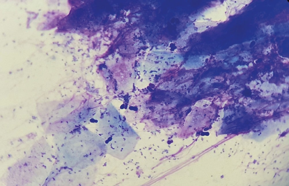 Pomiędzy fizjologicznymi resztkami keratyny, cytologia wymazu z ucha zawierała dużo bakterii (ziarniaków) oraz dużą liczbę drożdżaków Malassezia sp. (ryc. 1). Oprócz licznych nici chromatyny, obecne również były pojedyncze, nienaruszone neutrofile.
