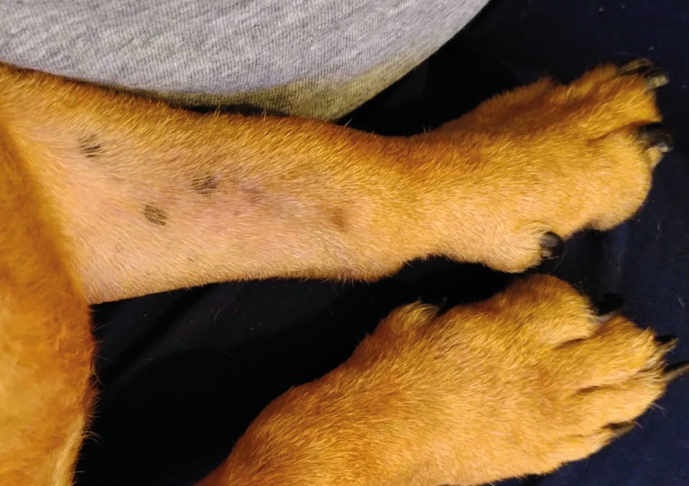 Ryc. 2: Umiarkowane łysienie, rumień i przebarwienia w dolnej części przedniej kończyny