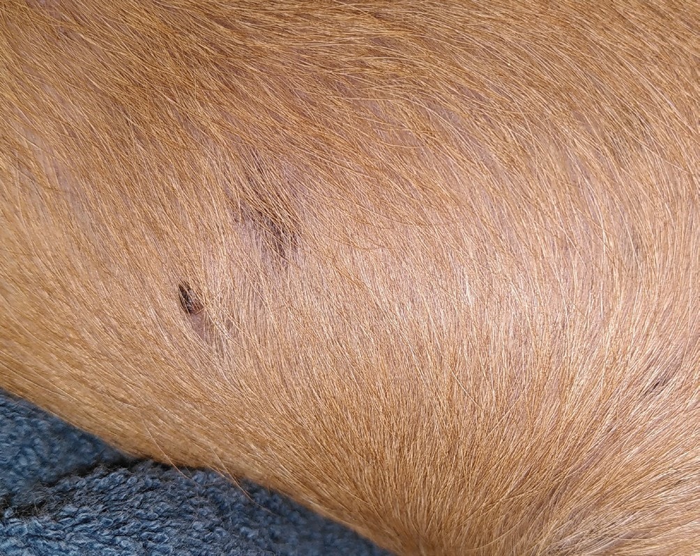 Ryc. 3: Wyraźnie widoczne łysienie i przebarwienia na brzuchu